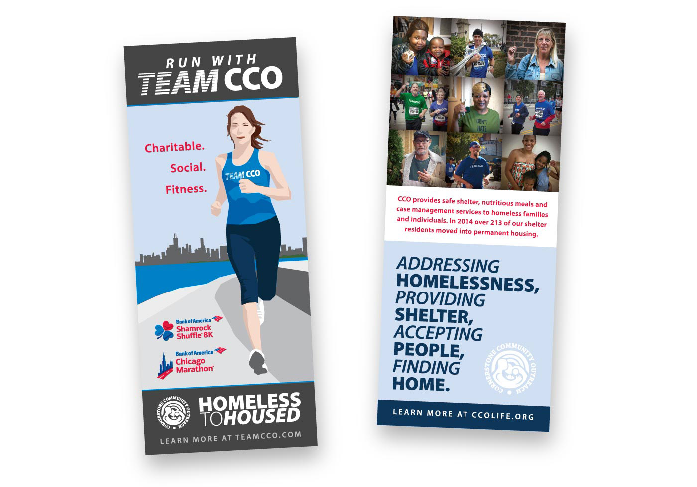 Rack card, social card, table-tops, backdrop, sail, and much more for Team CCO. Team CCO is a fundraising arm of CCO, a homeless shelter in Uptown Chicago.